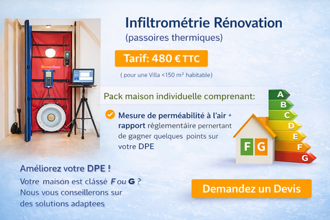 - Une mesure de perméabilité à l'air + rapport règlementaire permettant de gagner quelques points sur votre DPE.