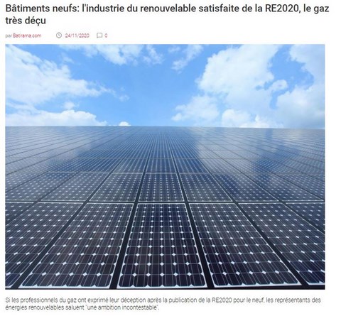 RE2020: Nous sommes déçus de l'intention politique exprimée ce matin : la RE2020 (voir notre article complet) prévoit la sortie du gaz dans le logement neuf, dès l'entrée en vigueur des décrets en 2021 pour les maisons individuelles et à partir de 2024 pour les logements collectifs", a réagi Patrick Corbin, président de l'Association française du gaz (AFG) dans un communiqué.