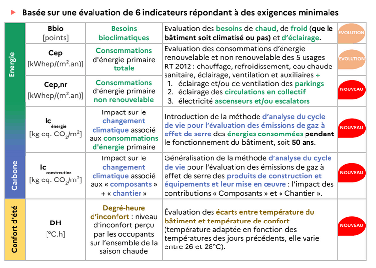 Elle poursuit des objectifs d’amélioration de la performance énergétique des bâtiments neufs, de réduction de leur impact sur le climat (prise en compte des émissions de gaz à effet de serre sur l’ensemble du cycle de vie des bâtiments) et de leur adaptation aux conditions climatiques futures (renforcement du confort d’été).